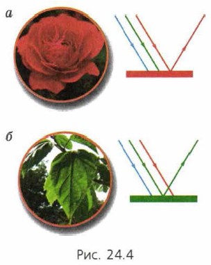 § 24. Цвет Окраска предметовПочему при освещении предметов белым светом мы видим их окрашенными в разные цвета? Дело в том, что разные предметы по-разному отражают и поглощают лучи разных цветов. Например, красная роза отражает «красные» лучи, входящие в состав белого света, а почти все другие лучи поглощает (схема на рис. 24.4, а). Зелёные же листья отражают в основном «зелёные» лучи (рис. 24.4, б).