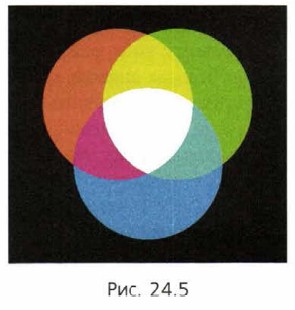 Нанесите осторожно на экран цветного телевизора капельку воды: она будет служить маленькой, но довольно сильной линзой. Сквозь капельку можно увидеть, что любое цветное изображение на экране состоит из светящихся красных, зелёных и синих точек — то есть точек, имеющих как раз те цвета, к которым наиболее чувствительны колбочки сетчатки глаза. Сложение цветов на экране телевизора схематически показано на рисунке 24.5.