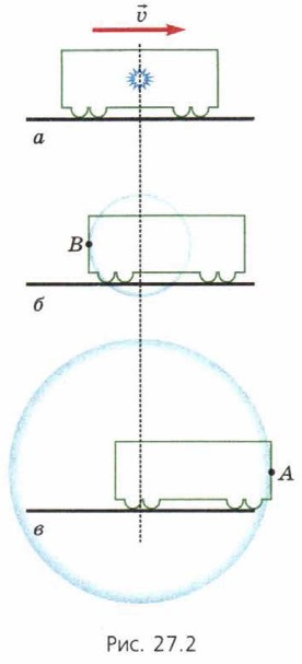§ 27. Некоторые следствия специальной теории относительности Относительность одновременности (окончание)Учтем, что в его системе отсчёта (как и в любой системе отсчёта!), свет тоже распространяется в любом направлении со скоростью с. Поэтому фронт волны тоже будет сферой, центр которой совпадает с местом вспышки света, а радиус увеличивается со скоростью с. Однако с точки зрения наблюдателя на платформе свет от вспышки проходит разные расстояния до передней и задней стенок! Ведь задняя стенка вагона движется навстречу фронту световой волны, а передняя, наоборот, удаляется от него. Значит, в системе отсчёта, связанной с платформой, свет дойдёт до задней стенки раньше, чем до передней!