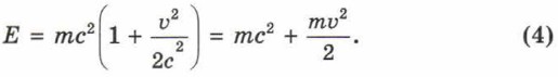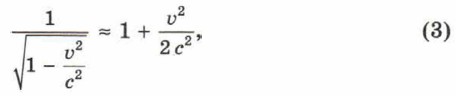 Формула (2) приводит к результатам, благодаря которым 20-й век стал «веком атома». Чтобы увидеть их, запишем формулу (2) для случая, когда υ << с. Можно показать, что в этом случае1 1 Чтобы убедиться в справедливости этой формулы при υ << с, возведите обе её части в квадрат и приведите к одному знаменателю. Вы увидите, что левую и правую части можно считать равными, если пренебречь