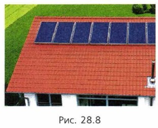 Солнечные батареи используют сегодня и как источник электрического тока в солнечных местностях: такую батарею размещают на крыше дома, а даваемая ею электроэнергия питает кондиционеры, охлаждающие помещение (рис. 28.8). Так солнечная энергия, когда она оказывается в избытке, сама же помогает ослабить нежелательные последствия этого избытка.