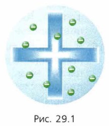§ 29. Строение атома Опыт РезерфордаМодель атома ТомсонаСлово «атом» в переводе с греческого означает «неделимый». И долгое время учёные действительно считали атом мельчайшей частицей вещества. Однако когда английский физик Дж. Томсон в конце 19-го века открыл электрон, у многих учёных появились серьёзные сомнения в неделимости атома. Дело в том, что масса электрона оказалась примерно в 2 тысячи раз меньше массы самого лёгкого из атомов, а это означало, что электрон каким-то образом входит в состав атома. Первую модель атома предложил сам Томсон. Согласно его предположению, атом представляет собой положительно заряженный шар диаметром около 10-10 м, внутри которого, подобно изюминкам в кексе, находятся отрицательно заряженные электроны (рис. 29.1).