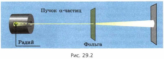 Идея опыта РезерфордаАнглийский физик Э. Резерфорд догадался, как можно проверить на опыте справедливость предложенной Томсоном модели атома. Для этого он решил бомбардировать атомы быстрыми заряженными частицами и наблюдать, как отклоняются эти частицы в результате их столкновений с атомами. К тому времени быстрые заряженные частицы уже имелись в распоряжении учёных: это были так называемые α-частицы1, заряд которых положителен и в 2 раза больше модуля заряда электрона, а масса примерно в 4 раза больше массы атома водорода, то есть почти в 8 тысяч раз больше массы электрона, α-частицы вылетают со скоростью около 20 000 км/с при самопроизвольных распадах некоторых атомных ядер. 1 В дальнейшем выяснилось, что α-частицы — это ядра атомов гелия. Если бы модель Томсона соответствовала действительности, очень массивные (по сравнению с электронами) и очень быстрые а-частицы должны были бы пролетать сквозь «атомы- кексы» с «изюминками-электронами», почти не замечая препятствия. Схема опыта РезерфордаНа рисунке 29.2 изображена схема опыта, поставленного Резерфордом в 1911 году.