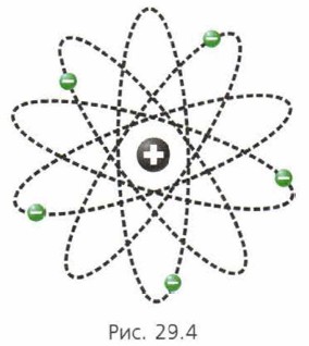§ 29. Строение атома Планетарная модель атомаРазмер атомного ядраПредположив, что налетающая на ядро а-частица взаимодействует с ядром в соответствии с законом Кулона, Резерфорд смог определить размер атомного ядра. И оказалось, что атомное ядро в десятки тысяч раз меньше атома: размеры ядер — около 10-14 - 10-15 м, в то время как размер атома — примерно 10-10 м. Представьте себе горошинку посреди футбольного поля, и вы получите некоторое представление об относительных размерах ядра и атома. А ведь в этой «горошинке» сосредоточена почти вся масса атома! Сходство строения атома со строением солнечной системыОсновываясь на своих опытах и расчётах, Резерфорд предложил планетарную модель атома, в которой атом как бы напоминает Солнечную систему в миниатюре: вокруг малого и массивного положительно заряженного ядра движутся по орбитам лёгкие электроны — подобно тому, как вокруг Солнца движутся планеты (рис. 29.4).
