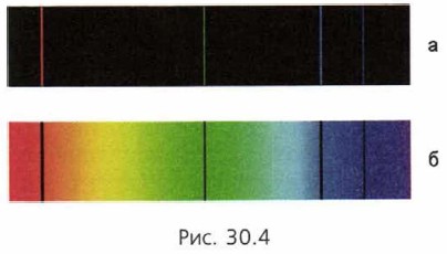 § 30. Атомные спектры Спектры излучения и поглощения (окончание)В середине 19-го века немецкий учёный Г. Кирхгоф заметил, что положение двух близко расположенных тёмных линий в солнечном спектре точно совпадает с положением ярких жёлтых линий в спектре паров натрия. И Кирхгоф предположил, что близкие тёмные линии — результат поглощения солнечного света парами натрия, находящимися во внешней атмосфере Солнца. Чтобы проверить это, учёный исследовал спектр белого света, прошедшего сквозь холодные пары натрия. И в непрерывном спектре действительно появились тёмные линии, положение которых точно совпало с линиями излучения паров натрия!