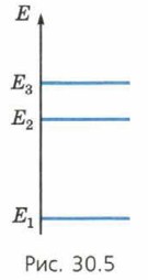 где Еk и Еn — уровни энергии, соответствующие стационарным состояниям. Так теория атома Бора объясняет линейчатый характер спектров излучения и поглощения атомов, а также то, что атомы каждого элемента излучают и поглощают свет с одними и теми же частотами, характерными только для этого элемента. Энергетические уровниЗначения энергии электрона в атоме называют энергетическими уровнями. При этом энергию электрона задают обычно в электрон-вольтах (сокращённо эВ). В предыдущем параграфе вы уже познакомились с этой единицей энергии. Напомним, что 1 эВ = 1,602 • 10-19 Дж. Схематическое изображение энергетических уровнейПри схематическом изображении энергетических уровней шкалу энергии обычно располагают вертикально, а сами уровни обозначают справа от этой шкалы горизонтальными отрезками. На рисунке 30.5 схематически изображены три энергетических уровня.