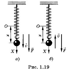 С энергетической точки зрения условия для перекачки энергии в колебательную систему от внешних тел, действующих на систему с периодической силой, в данном случае очень неблагоприятны. В самом деле: четверть периода, когда тело смещается от положения равновесия, внешняя сила совершает положительную работу, так как сила и скорость тела, а значит, и перемещение направлены в одну сторону (рис. 1.19, a). Но в следующую четверть периода, когда тело возвращается к положению равновесия, сила и скорость (а значит, и перемещение) направлены в противоположные стороны (рис. 1.19, б). Работа внешней силы при этом отрицательна. Та же картина будет наблюдаться во вторую половину периода. В целом за период работа внешней силы почти точно равна нулю. Лишь малая часть работы внешней силы идет на компенсацию работы силы трения, так как скорость движения тела при ω << ω0 очень мала, и поэтому мало значение силы трения. Здесь имеется некоторая тонкость, иногда затрудняющая понимание сути дела. Если смещение от положения равновесия прямо пропорционально силе в любой момент времени, то казалось бы на первый взгляд, что работа должна быть все время положительной. Однако надо иметь в виду, что знак работы зависит от совпадения направления силы и направления перемещения, т. е. скорости, а не знака координаты. Для того чтобы работа была положительной, необходимо совпадение знаков Fх и Δx: Надо хорошо представлять себе, что когда сила и координата достигают максимальных значений, то после этого сила начинает уменьшаться, не меняя направления, а скорость меняет направление. Вынужденные колебания большой частотыВ случае ω >> ω0 в левой части уравнения (1.9.5) наибольшим будет первый член, амплитуда которого пропорциональна квадрату частоты. Он играет основную роль и поэтому можно записать