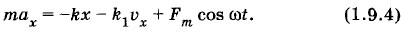 Глава 1. Механические колебания Вынужденные колебанияУравнение движения для вынужденных колебанийПриступим к решению основной задачи: выясним, от чего и как зависят амплитуда хm вынужденных колебаний и сдвиг фаз φс. Для этого запишем и исследуем уравнение движения для вынужденных колебаний. Пусть на колебательную систему (груз на пружине) действует внешняя периодическая сила Fx = Fm cos ωt. Кроме того, на тело действует сила упругости (Fу)x = -kx и сила сопротивления, пропорциональная скорости: (Fc)x = -k1υx, где k1 — коэффициент сопротивления. (При малых скоростях движения тела силу сопротивления можно считать пропорциональной скорости.) Тогда уравнение движения запишется так: