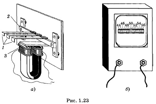 Теперь можно изобразить примерный вид зависимости сдвига фаз φс от частоты. Мы знаем, что при малых частотах (ω ≈ 0) сдвиг фаз между колебаниями координаты и силы равен нулю. При резонансе сдвиг фаз равен Если частота велика (ω → ∞), то сдвиг фаз стремится к -π. На рисунке 1.22 представлен график зависимости сдвига фаз между колебаниями координаты и внешней силы в зависимости от частоты вынужденных колебаний. Можно показать, что чем меньше коэффициент сопротивления, тем резче происходит изменение сдвига фаз вблизи резонанса. Применение резонанса и борьба с нимЕсли какая-либо колебательная система находится под действием внешней периодической силы, то может наступить резонанс и связанное с ним резкое увеличение амплитуды колебаний. Любое упругое тело, будь то мост, станина машины, ее вал, корпус корабля, представляет собой колебательную систему и характеризуется собственными частотами колебаний. При работе двигателей нередко возникают периодические усилия, связанные с движением частей двигателя (например, поршней) или же с недостаточно точной центровкой их вращающихся деталей (например, валов). Если частота периодических усилий совпадает с частотой свободных колебаний, то возникает резонанс. Амплитуда колебаний может возрасти настолько, что возможна поломка машин. Во всех этих случаях принимаются специальные меры, чтобы не допустить наступления резонанса или ослабить его действие. Для этого увеличивают затухание в системе или же добиваются, чтобы собственные частоты колебаний не совпадали с частотой внешней силы. Известны случаи, когда приходилось перестраивать океанские лайнеры, чтобы уменьшить вибрацию. При переходе через мост воинским частям запрещается идти в ногу. Строевой шаг приводит к периодическому воздействию на мост. Если случайно частота этого воздействия совпадет с собственной частотой колебаний моста, то он может разрушиться. Такой случай произошел в 1906 г. в Петербурге при переходе кавалерийского эскадрона через мост на реке Фонтанке. Мы до сих пор приводили примеры вредных последствий резонанса. Есть, конечно, и полезные. Простейший пример — раскачивание качелей. На явлении резонанса основано устройство частотомера — прибора для измерения частоты переменного тока. Прибор состоит из набора упругих пластин 1 с грузиками на концах. Пластины закреплены на общей планке 2 (рис. 1.23, а). Каждая пластина обладает определенной собственной частотой колебаний, зависящей от ее упругих свойств, длины и массы. Частоты колебаний пластин известны. Под действием электромагнита 3 планка, а с ней вместе и все пластины совершают вынужденные колебания. Но лишь та пластина, собственная частота колебаний которой совпадает с частотой колебаний планки, будет иметь большую амплитуду колебаний. Это и позволяет определить частоту переменного тока (рис. 1.23, б).