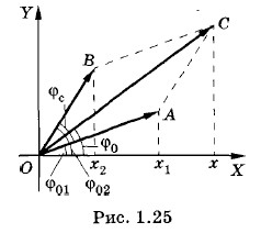 осуществляется так. Строят векторы φc = φ02- φ01, (1.11.5) представляет собой сдвиг фаз между этими колебаниями. Так как частоты складываемых колебаний равны, то угол φc между векторами Проекция суммарного вектора x = х1 + х2 = c cos (ωt + φ0). (1.11.6) Оно происходит с той же частотой ю, что и колебания х1 и х2. Модуль с вектора