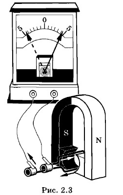 Вынужденные электрические колебания возникают в электрической цепи под действием периодической электродвижущей силы. Переменную ЭДС можно получить в проволочной рамке из нескольких витков при вращении ее с постоянной угловой скоростью в постоянном магнитном поле (рис. 2.3). При этом магнитный поток через поверхность рамки будет периодически меняться. Согласно закону электромагнитной индукции в рамке возникнет переменная ЭДС. При замыкании цепи через гальванометр пойдет переменный ток, и стрелка прибора начнет колебаться около положения равновесия.