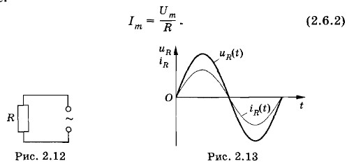 Следовательно, в проводнике с активным сопротивлением колебания силы тока по фазе совпадают с колебаниями напряжения (рте. 2.13), а амплитуда силы тока равна амплитуде напряжения, деленной на сопротивление: