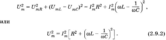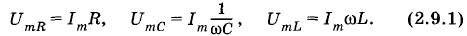 Чему равна амплитуда силы тока в такой цепи (колебательном контуре), если на ее концах поддерживается напряжение u(t) = Um sin ωt? Мы видели, что при включении по отдельности в цепь проводника с активным сопротивлением R, конденсатора емкостью С или катушки с индуктивностью L амплитуда силы тока определяется соответственно формулами (2.6.2), (2.7.3) и (2.8.4). Амплитуды же напряжений на резисторе, катушке индуктивности и конденсаторе связаны с амплитудой силы тока так: