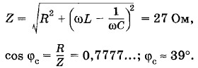 График изменения напряжения в зависимости от времени представлен на рисунке 2.33. Задача 3В цепь переменного тока стандартной частоты (ν = 50 Гц) последовательно включены резистор сопротивлением R = 21 Ом, катушка индуктивностью L = 0,07 Гн и конденсатор емкостью С = 82 мкФ (см. рис. 2.20). Определите индуктивное, емкостное и полное сопротивления цепи, а также сдвиг фаз между силой тока и напряжением. Решение. Индуктивное сопротивление находим по формуле (2.8.5): XL = ωL = 2πνL = 22 Ом. Емкостное сопротивление вычисляется по формуле (2.7.4):