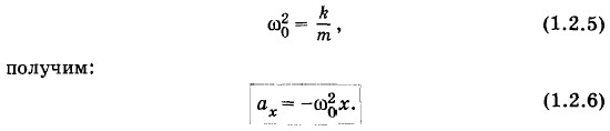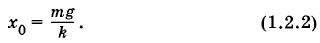 где х — координата груза относительно положения равновесия. Величина x0 + х представляет собой удлинение пружины (см. рис. 1.7). Уравнение движения груза запишется так: mаx = -k(x + x0) + mg. (1.2.3) Подставляя в это уравнение значение x0 из выражения (1.2.2), получим окончательно: mах = -kx. (1.2.4) Уравнение движения не содержит силы тяжести. Сила тяжести, действуя на груз, вызывает растяжение пружины на постоянную величину. Но это не влияет на характер движения груза. Просто колебания происходят относительно положения равновесия тела при растянутой на x0 пружине. В отсутствие тяготения уравнение движения (1.2.4) имело бы точно такую же форму, но только колебания происходили бы относительно конца нерастянутой пружины. Наличие силы тяжести несущественно для колебаний груза на пружине в отличие от колебаний маятника. Масса m и жесткость пружины k — постоянные величины. Разделив левую и правую части уравнения (1.2.4) на m и введя новое обозначение