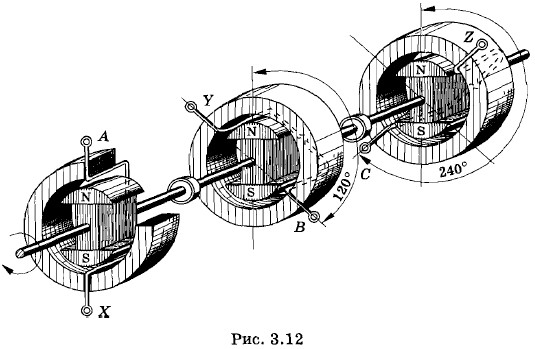 Трехфазным током называется система трех гармонических токов одинаковых частот и амплитуд, сдвинутых по фазе на 1/3 периода (φ = 120°, или 2π/3). Генератор трехфазного токаТрехфазную систему токов принципиально можно получить от трех одинаковых генераторов переменного однофазного тока. Одинаковые роторы у этих генераторов насажены жестко на общий вал (рис. 3.12). Статорные обмотки генераторов повернуты друг относительно друга на 120° в сторону вращения роторов (см. рис. 3.12).