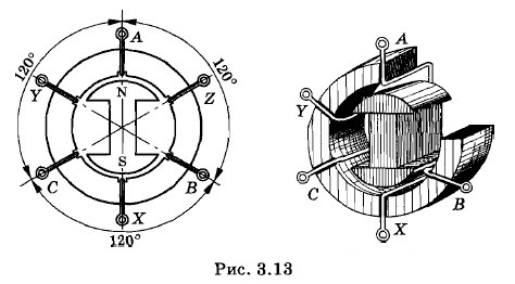 При равномерном вращении роторов в статорных обмотках каждого генератора индуцируется гармоническая ЭДС (см. § 3.2). Частоты и амплитуды всех трех ЭДС совпадают. Колебания ЭДС второго генератора запаздывают по фазе относительно колебаний ЭДС первого генератора на 2φ/3 (120°), а колебания ЭДС третьего генератора запаздывают относительно колебаний ЭДС второго генератора тоже на 2φ/3 (120°) или относительно колебаний ЭДС первого генератора на 4φ/3 (240°). Объясняется это тем, что в процессе вращения роторы пересекают плоскости статорных обмоток второго и третьего генераторов с запаздыванием соответственно на1/3 и 2/3 периода по сравнению с моментом прохождения ротора через плоскость статорной обмотки первого генератора. Один из выводов обмотки генератора называют ее началом, а другой — концом. Какой вывод считать началом, а какой — концом, зависит от выбора положительного направления обхода контура статорной обмотки. Этот выбор, хотя и является произвольным, должен быть одинаковым для всех генераторов. Примем, например, за положительное направление обхода статорной обмотки первого генератора направление по часовой стрелке, если смотреть на эту обмотку со стороны выхода из плоскости обмотки северного полюса индуктора (ротора). Тогда началом обмотки является клемма А, а ее концом — клемма X. Так же определяются начала (Б и С) и концы (У и Z) статорных обмоток второго и третьего генераторов (см. рис. 3.12). Но получение трехфазного тока при помощи трех генераторов оказывается технически сложным и экономически невыгодным. Гораздо проще все три статорные обмотки совместить в одном корпусе (рис. 3.13) и вместо трех роторов применить один. Такой генератор называется генератором трехфазного тока.