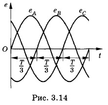 Таким образом, статор генератора трехфазного тока имеет три уложенные в пазах статора независимые обмотки, сдвинутые в пространстве одна относительно другой на 1/3 окружности статора. Каждая статорная обмотка называется фазой* генератора. * Этот термин не следует путать с фазой гармонически колеблющейся величины. Ротор генератора трехфазного тока конструктивно ничем не отличается от ротора генератора однофазного тока. При вращении ротора во всех обмотках статора индуцируются одинаковые по частоте и амплитуде ЭДС, но сдвинутые по фазе на 2π/3. Приняв за начало отсчета времени момент, в который ЭДС первой фазы еА имеет нулевое значение (рис. 3.14), можно записать: еА = Электродвижущая сила второй фазы генератора, отстающая от ЭДС первой фазы на 2π/3, равна: