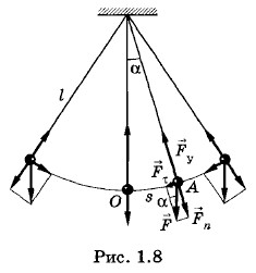 При колебаниях шарика на нерастяжимой нити он всегда движется по дуге окружности, радиус которой равен длине нити l. Поэтому положение шарика в любой момент определяется одной величиной — углом α отклонения нити от вертикали (см. рис. 1.8). Будем считать угол α положительным, если маятник отклонен вправо от положения равновесия, и отрицательным, если он отклонен влево. Уравнение для тангенциальной составляющей ускоренияТангенциальная проекция силы тяжести в момент, когда нить маятника отклонена от положения равновесия на угол а, выражается так: Fτ = -F sin α = -mg sin α. (1.3.1) (Мы считаем значение проекции положительным, если составляющая силы направлена слева направо.) Знак «-» в уравнении (1.3.1) стоит из-за того, что Fτ и α имеют противоположные знаки. При отклонении маятника вправо (α > 0) составляющая Согласно второму закону Ньютона mаτ = Fτ, или mаτ =-mg sin α. (1.3.2) Разделив левую и правую части этого уравнения на т, получим: аτ =-g sin α. (1.3.3) До сих пор считалось, что углы отклонения нити от вертикали могут быть любыми. В дальнейшем будем считать их малыми. При малых углах, если выражать угол α в радианах, sin α ≈ α. Следовательно, aτ = -gα. (1.3.4) Смещение шарика маятника от положения равновесия можно характеризовать не только углом, но и величиной, измеряемой длиной дуги ОА (см. рис. 1.8), взятой со знаком «+», если шарик смещается от положения равновесия вправо, и со знаком «-», если он смещается влево. Очевидно, что