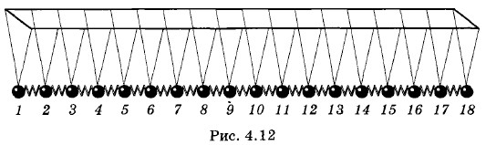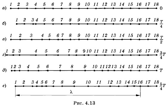 Пусть шар 1 приведен в колебательное движение с периодом Т и амплитудой sm. Спустя четверть периода он сместится вправо на расстояние sm и с помощью пружины приведет в движение шар 2, который, в свою очередь, заставит двигаться шар 3, и т. д. Но шар 2 начнет движение позднее шара 1, шар 3 позднее шара 2 и т. д. Поэтому, когда шар 1 сместится на расстояние sm, шар 2 сместится от своего положения равновесия на меньшее расстояние, шар 3 — еще на меньшее, а шар 4 и все последующие вообще пока не начнут двигаться. В результате шары займут положение, указанное на рисунке 4.13, б.