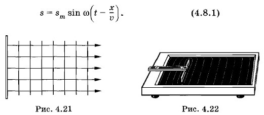 Волна при своем распространении от какого-либо источника в сплошной среде постепенно захватывает все большие и большие области пространства. Это хорошо видно, если наблюдать за круговыми волнами на поверхности воды от брошенного камня. Энергия, которую несут с собой волны от источника, с течением времени распределяется по все большей и большей поверхности. Поэтому энергия, переносимая через данную площадку за данный промежуток времени, уменьшается по мере удаления от источника. Следовательно, и амплитуда колебаний уменьшается по мере удаления от источника. Ведь энергия колеблющегося тела пропорциональна квадрату амплитуды (см. § 1.7). Это справедливо для колебаний не только груза на пружине и маятника, но и любой частицы среды. Таким образом, амплитуда волны в среде по мере удаления ее от источника всегда уменьшается, даже если механическая энергия не превращается во внутреннюю за счет действия в среде сил трения. Плоская волнаИсключение составляет так называемая плоская волна. Такую волну можно получить, если поместить в упругую среду пластину и заставить ее колебаться в направлении нормали к пластине. Все точки среды, примыкающие к пластине, будут совершать колебания с одинаковыми амплитудами и в одной и той же фазе. Эти колебания будут распространяться в виде волн в направлении нормали к пластине. Причем все частицы среды, лежащие в плоскости, параллельной пластине, будут колебаться в одной фазе. Волновая поверхность, луч и волновой фронтПоверхности равной фазы называют волновыми поверхностями. В случае плоской волны волновые поверхности представляют собой плоскости (рис. 4.21). Реальная волна может считаться плоской лишь приближенно (на краях волновые поверхности искривляются). Уравнение бегущей плоской гармонической волны будет точно таким же, как и уравнение (4.5.3) или (4.5.7) для волны на резиновом шнуре: