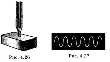 Резкой границы между музыкальными звуками и шумами нет. Испорченный музыкальный инструмент или заигранная грампластинка создает хриплые, дребезжащие звуки, весьма похожие на шум. С другой стороны, некоторую музыкальность можно уловить в шуме дождя или вое ветра. Музыкальные звукиЧем с точки зрения физики отличаются музыкальные звуки от шума и по какой причине столь несхожими могут быть музыкальные звуки между собой? Чистый музыкальный звук можно получить с помощью простого прибора, называемого камертоном. На рисунке 4.26 показан камертон, который закреплен на деревянном ящике, открытом с одной стороны. Ударив молоточком по одной из ветвей камертона, мы услышим музыкальный звук. Постепенно звук ослабевает вследствие затухания колебаний ветвей. Звуковая волна возбуждается колеблющимися ветвями камертона. Характер этих колебаний можно установить, если прикрепить к ветви камертона иглу и провести ею с постоянной скоростью по поверхности закопченной стеклянной пластинки. На пластинке появится линия, очень близкая к синусоиде (рис. 4.27). Это временна́я развертка колебаний, подобная той, которую получают с помощью маятника с песочницей. Отсюда можно заключить, что колебания ветвей камертона очень близки к гармоническим.
