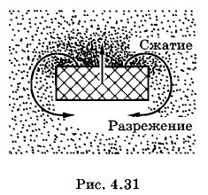 При движении ветви камертона по одну сторону от нее воздух сжимается (давление растет), а по другую сторону образуется разрежение (давление падает). Возникает разность давлений, которая стремится выравняться. Выравнивание давления происходит со скоростью распространения упругого импульса, т. е. со скоростью звука. За период колебания давление выравнивается на расстоянии длины звуковой волны. Размеры же ветви камертона гораздо меньше длины волны. Поэтому при колебаниях ветви происходит «перекачка» воздуха с одной ее стороны на другую сторону (рис. 4.31). Следовательно, давление в основном выравнивается, и звуковая волна почти не излучается.