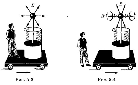 Зависимость характеристик электрического и магнитного полей от системы отсчетаНельзя создать переменное магнитное поле без того, чтобы одновременно в пространстве не возникло и электрическое поле. И наоборот, переменное электрическое поле не может существовать без магнитного. Правда, покоящийся заряд создает только электрическое поле (рис. 5.3). Но ведь заряд покоится лишь относительно определенной системы отсчета. Относительно других систем отсчета он будет двигаться и, следовательно, создавать и магнитное поле (рис. 5.4).