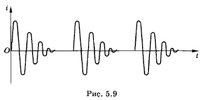 Для возбуждения колебаний в таком контуре нужно провод разрезать посредине так, чтобы остался небольшой воздушный промежуток, называемый искровым (рис. 5.8, а). Благодаря этому промежутку можно зарядить оба проводника до высокой разности потенциалов. Когда разность потенциалов превысит некоторое предельное значение, проскакивает искра, цепь замыкается и в открытом контуре возникают колебания (рис. 5.8, б). Из-за малой емкости и индуктивности частота колебаний очень велика. Колебания, разумеется, будут затухающими по двум причинам: во-первых, вследствие наличия у вибратора активного сопротивления, которое особенно велико в искровом промежутке; во-вторых, из-за того, что вибратор излучает электромагнитные волны и теряет при этом энергию. После того как колебания прекратятся, источник вновь заряжает оба проводника до наступления пробоя искрового промежутка и все повторяется сначала (рис. 5.9).