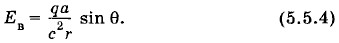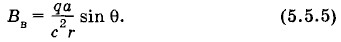 Полученное выражение совершенно справедливо и вытекает из уравнений Максвелла при скорости движения υ << с. Оно оказывается правильным для всех случаев ускоренного движения заряда, а не только при торможении*. Любое ускорение заряда сопровождается излучением электромагнитной волны. * Отметим, что напряженность вихревого поля волны на расстоянии r от излучающей частицы определяется ускорением в более ранний момент времени Возникает естественный вопрос: как же удалось получить правильный общий результат, не учитывая ни порождения электрического поля магнитным, ни обратного процесса порождения магнитного поля переменным электрическим полем? На самом деле эти процессы неявно были учтены. В наших рассуждениях было принято, что электромагнитные возмущения распространяются с конечной скоростью с. Этот факт не был нами теоретически обоснован. Он является следствием уравнений Максвелла и вытекает из существования упомянутых выше процессов. Большим недостатком данного упрощенного рассмотрения является то, что с его помощью нельзя получить значение другой характеристики поля — магнитной индукции. Оказывается, что магнитная индукция волны определяется такой же формулой, что и напряженность электрического поля: