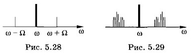 Амплитудно-модулированное колебание в нашем простом случае представляет собой сумму трех гармонических колебаний, происходящих с частотами ω, ω + Ω и ω - Ω. Наряду с колебаниями несущей частоты появились дополнительные колебания с частотами ω + Ω и ω - Ω, называемыми боковыми частотами. Амплитуды колебаний верхней (ω + Ω) и нижней (ω - Ω) боковых частот одинаковы и определяются глубиной модуляции. На рисунке 5.28 представлен спектр модулированных колебании. Преобразование колебаний, связанное с появлением новых частот колебаний, называется нелинейным. Модуляция — нелинейный процесс; она осуществляется с помощью устройства, вольт-амперная характеристика которого нелинейна.