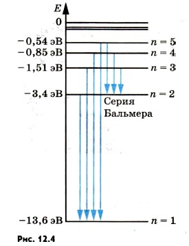 Теория Бора приводит к количественному согласию с экспериментом для значений этих частот. Все частоты излучений атома водорода составляют в своей совокупности ряд серий, каждая из которых образуется при переходах атома в одно из энергетических состояний со всех верхних энергетических состояний (состояний с большей энергией). Переходы в первое возбужденное состояние (на второй энергетический уровень) с верхних уровней образуют серию Бальмера. На рисунке 12.4 эти переходы изображены стрелками. Красная, зеленая и две синие линии в видимой части спектра водорода (см. рис. V, 3 на цветной вклейке) соответствуют переходам Е3 → Е2, Е4 → Е2, Е3 → Е2, Е6 → Е2. Данная серия названа по имени швейцарского учителя И. Бальмера, который еще в 1885 г. на основе экспериментальных данных получил простую формулу для определения частот видимой части спектра водорода. Поглощение светаПоглощение света — процесс, обратный излучению. Атом, поглощая свет, переходит из низших энергетических состояний в высшие. При этом он поглощает излучение той же самой частоты, которую излучает, переходя из высших энергетических состояний в низшие. На основе двух постулатов и правила квантования Бор определил радиус атома водорода и энергии стационарных состояний атома. Это позволило вычислить частоты излучаемых и поглощаемых атомом электромагнитных волн. Вопросы к параграфу 1. В чем заключаются противоречия между постулатами Бора и законами классической механики и классической электродинамики? 2. Какое излучение наблюдается при переходах электрона в атоме водорода на второй энергетический уровень?