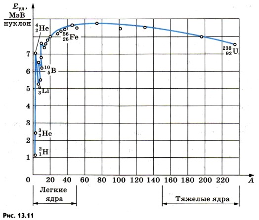 Глава 13. Физика атомного ядра Энергия связи атомных ядерЭнергия связиЭнергия связи — это энергия, которая выделяется при образовании ядра из отдельных частиц, и соответственно это та энергия, которая необходима для расщепления ядра на составляющие его частицы. О том, как велика энергия связи, можно судить по такому примеру: образование 4 г гелия сопровождается выделением такой же энергии, что и при сгорании 1,5—2 вагонов каменного угля. Важную информацию о свойствах ядер содержит зависимость удельной энергии связи от массового числа А. Удельная энергия связиУдельной энергией связи называют энергию связи, приходящуюся на один нуклон ядра. Ее определяют экспериментально. Из рисунка 13.11 хорошо видно, что, не считая самых легких ядер, удельная энергия связи примерно постоянна и равна 8 МэВ/нуклон. Отметим, что энергия связи электрона и ядра в атоме водорода, равная энергии ионизации, почти в миллион раз меньше этого значения. Кривая на рисунке 13.11 имеет слабо выраженный максимум. Максимальную удельную энергию связи (8,6 МэВ/нуклон) имеют элементы с массовыми числами от 50 до 60, т. е. железо и близкие к нему по порядковому номеру элементы. Ядра этих элементов наиболее устойчивы.