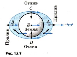 Под действием лунного притяжения водная оболочка Земли принимает слегка вытянутую в сторону Луны (и противоположную сторону) форму. Там, где Луна выше всего над горизонтом и где ниже всего под горизонтом, будет прилив. На восходе и заходе Луны будут наблюдаться отливы (рис. 15.9). Действительно, ближайшая к Луне точка А будет испытывать большее притяжение к Луне, чем центр Земли Е и точка С (эти силы отмечены синим цветом). Разница сил между точками А и Е называется приливной силой (отмечена черной стрелкой), и она направлена от центра Земли к Луне. В точке В приливная сила направлена в противоположную сторону от Луны, а в точках С и D приливная сила направлена к центру Земли. Таким образом, вода под действием приливной силы будет оттекать из С и D (отлив) и собираться в А и В (прилив). Во время приливов уровень воды плавно нарастает, достигая наибольшего значения, а затем постепенно снижается до низшего уровня. Вследствие вращения Земли приливные выступы образуются в каждый следующий момент уже в новых точках земной поверхности. Максимумы подъемов воды чередуются через определенные промежутки времени, близкие к 12 ч 26 мин. Таким образом, в каждом месте океанского берега за 24 ч 52 мин бывают два прилива и два отлива. Максимальные приливы бывают, когда Луна находится выше всего над горизонтом и ниже всего под горизонтом. Из-за движения Луны вокруг Земли Луна проходит выше всего над горизонтом как раз через 24 ч 52 мин. Это указывает на взаимосвязь между Луной и приливами. Действительно, явление приливов вызывается притяжением Луны. Солнце, как и Луна, также вызывает приливы. Несмотря на большую удаленность от Земли, но благодаря большой массе Солнца приливы, которые оно вызывает, всего в 2,5 раза меньше лунных. Во время полнолуний и новолуний лунные и солнечные приливы складываются и наблюдаются самые большие приливы. Напротив, когда Луна в первой или последней четверти, во время лунного прилива будет солнечный отлив; действие Солнца вычитается из действия Луны, и приливы бывают существенно меньшими. Луна движется вокруг Земли по эллиптической орбите. Смена лунных фаз определяется изменением вида освещенной стороны Луны. Движением Луны вокруг Земли объясняются лунные и солнечные затмения. Явление приливов и отливов обусловлено притяжением Луны и большими размерами Земли.
