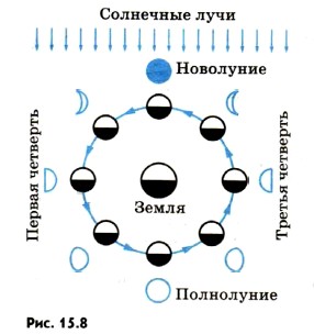 Видимое перемещение Луны происходит неравномерно, потому что Луна движется в пространстве по эллиптической орбите, в одном из фокусов которой находится центр Земли. Большая полуось лунной орбиты а = 384 400 км = = 60,ЗR⊕ (R⊕ — радиус Земли), эксцентриситет е = 0,055. Луна, подобно Земле, представляет собой темный непрозрачный шар, светящий отраженным солнечным светом. Солнце всегда освещает примерно половину этого шара, другая половина остается темной. Но так как к Земле обыкновенно бывают обращены и часть светлого видимого полушария, и часть неосвещенного, то Луна большую часть времени кажется нам неполной. Различают четыре основные фазы Луны: новолуние, первая четверть, полнолуние и последняя четверть. На рисунке 15.8 показаны положения Луны относительно Земли и Солнца для различных фаз. Интервал времени между двумя последовательными новолуниями, равный 29,5 сут., получил название синодический месяц (период). Синодический месяц лежит в основе лунного календаря. Солнечные и лунные затменияПериодически Луна частично или полностью заслоняет Солнце — такое явление называется солнечным затмением, оно может произойти во время новолуний. Когда Луна попадает в тень Земли, наступает лунное затмение, которое может наступить во время полнолуний. Вследствие наклона лунной орбиты к эклиптике эти явления происходят не каждый месяц, а значительно реже. На протяжении календарного года происходят от 2 до 5 солнечных затмений и от 0 до 3 лунных затмений. Еще древние вавилоняне заметили, что все затмения повторяются в том же порядке примерно через 18 лет и 11 дней. Этот период у древних вавилонян назывался циклом Сароса (в переводе с египетского арос — повторение), им пользовались для предсказаний затмений.