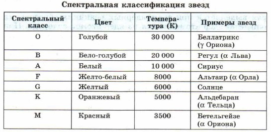Глава 16. Солнце и звезды § 121. Основные характеристики звездДиаграмма «спектр — светимость»Как и Солнце, звезды освещают Землю, но из-за огромного расстояния до них освещенность, которую они создают на Земле, на много порядков меньше солнечной. По этой причине и возникают технические проблемы при измерениях освещенности от звезд. Астрономы строят гигантские телескопы, чтобы уловить слабые излучения звезд. Чем больше диаметр объектива телескопа, тем более слабые звезды можно с его помощью исследовать. Измерения показали, что, например, Полярная звезда создает освещенность на поверхности Земли Е = 3,8 • 10-9 Вт/м2, что в 370 млрд раз меньше освещенности, создаваемой Солнцем. Расстояние до Полярной звезды составляет 200 пк, или около 650 св. лет (r = б • 1018 м). Поэтому светимость Полярной звезды Lп = 4πr2Е = 4 • 3,14 х (6 • 1018 м)2 • 3,8 • 10-9 Вт/м2 = 9,1 • 1029 Вт = 4600 L Измерения показали, что среди звезд встречаются звезды в сотни тысяч раз более мощные, чем Солнце, и звезды со светимостями в десятки тысяч раз меньшими, чем у Солнца. Измерения температур поверхности звезд показали, что температура поверхности звезды определяет ее видимый цвет и наличие спектральных линий поглощения тех или иных химических элементов в ее спектре. Так, Сириус сияет белым цветом и его температура равна почти 10 000 К. Звезда Бетельгейзе (α Ориона) имеет красный цвет и температуру поверхности около 3500 К. Солнце желтого цвета имеет температуру 6000 К. По температуре, по цвету и виду спектра все звезды разбили на спектральные классы, которые обозначаются буквами О, В, A, F, G, К, М. Спектральная классификация звезд приведена ниже в таблице. Имеется еще одна интересная связь между спектральным классом звезды и ее светимостью, которая представляется в виде диаграммы (рис. 16.2) «спектр — светимость (в светимостях Солнца)» (ее еще называют диаграммой Герцшпрунга—Рессела в честь двух астрономов — Э. Герцшпрунга и Г. Рессела, построивших ее). На диаграмме четко выделяются четыре группы звезд. Главная последовательностьНа нее ложатся параметры большинства звезд. К звездам главной последовательности относится и наше Солнце. Плотности звезд главной последовательности сравнимы с солнечной плотностью.