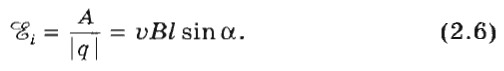Сила, с которой магнитное поле действует на движущуюся заряженную частицу, равна по модулю Fл = |q|υ B sin α. (2.5) Направлена эта сила вдоль проводника MN. Работа силы Лоренца1 на пути I положительна и составляет: А = FЛl = |q| υ Bl sin α. 1 Это неполная работа силы Лоренца. Кроме силы Лоренца (см. формулу (2.5)), имеется составляющая силы Лоренца, направленная против скорости и проводника. Эта составляющая тормозит движение проводника и совершает отрицательную работу. В результате полная работа силы Лоренца оказывается равной нулю. Электродвижущая сила индукции в проводнике MN равна, по определению, отношению работы по перемещению заряда q к этому заряду: