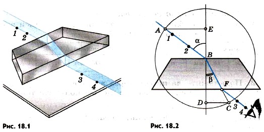 где α — угол падения пучка света на грань пластины (из воздуха в стекло); β — угол преломления светового пучка в стекле. Для определения отношения, стоящего в правой части формулы, поступают следующим образом. Перед тем как направить на пластину световой пучок, ее располагают на столе на листе миллиметровой бумаги (или листе бумаги в клетку) так, чтобы одна из ее параллельных граней совпала с предварительно отмеченной линией на бумаге. Эта линия укажет границу раздела сред воздух — стекло. Тонко очиненным карандашом проводят линию вдоль второй параллельной грани. Эта линия изображает границу раздела сред стекло — воздух. После этого, не смещая пластины, на ее первую параллельную грань направляют узкий световой пучок под каким-либо углом к грани. Вдоль падающего на пластину и вышедшего из нее световых пучков тонко очиненным карандашом ставят точки 1, 2, 3 и 4 (рис. 18.1). После этого лампочку выключают, пластину снимают и с помощью линейки прочерчивают входящий, выходящий и преломленный лучи (рис. 18.2).