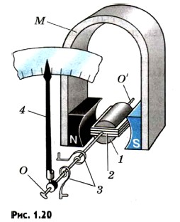 Измерительный прибор магнитоэлектрической системы устроен следующим образом (рис. 1.20). На легкую алюминиевую рамку 2 прямоугольной формы с прикрепленной к ней стрелкой 4 намотана катушка. Рамка укреплена на двух полуосях ОО'. В положении равновесия ее удерживают две тонкие спиральные пружины 3. Силы упругости со стороны пружин, возвращающие катушку в положение равновесия, пропорциональны углу отклонения стрелки от положения равновесия. Катушку помещают между полюсами постоянного магнита М с наконечиками специальной формы. Внутри катушки расположен цилиндр 1 из железа. Такая конструкция обеспечивает радиальное направление линий магнитной индукции в той области, где находятся витки катушки (рис. 1.21). В результате при любом положении катушки силы, действующие на нее со стороны магнитного поля, максимальны и при неизменной силе тока постоянны.