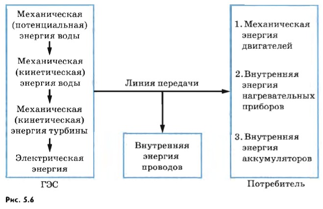 На гидроэлектростанциях (ГЭС) для вращения роторов генераторов используется потенциальная энергия воды. Роторы электрических генераторов приводятся во вращение гидравлическими турбинами. Мощность такой станции зависит от создаваемой плотиной разности уровней воды (напор) и от массы воды, проходящей через турбину в каждую секунду (расход воды). Превращения энергии показаны на схеме, приведенной на рисунке 5.6.