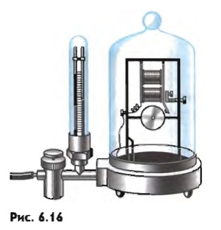 Хорошо проводит звук земля. Русский историк Н. М. Карамзин сообщает, что Дмитрий Донской перед Куликовской битвой, приложив ухо к земле, услышал топот копыт конницы противника, когда она еще не была видна. Если поднести вплотную к уху конец длинной деревянной линейки и слегка постучать по другому ее концу ручкой, то будет отчетливо слышен звук. Отодвинув же линейку немного от уха, вы обнаружите, что звук почти перестает быть слышимым. В вакууме звуковые волны распространяться не могут. Для доказательства этого можно, например, электрический звонок поместить под колокол воздушного насоса (рис. 6.16). По мере того как давление воздуха под колоколом уменьшается, звук будет ослабевать до тех пор, пока не прекратится совсем.