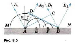 Глава 8. Световые волны Принцип Гюйгенса. Закон отражения светаВ момент, когда волна достигнет точки В и в этой точке начнется возбуждение колебаний, вторичная волна с центром в точке А уже будет представлять собой полусферу радиусом r = AD = υΔt = СВ. Фронты вторичных волн от источников, расположенных между точками А и В, показаны на рисунке 8.5. Огибающей фронтов вторичных волн является плоскость DB, касательная к сферическим поверхностям. Она и представляет собой фронт отраженной волны. Лучи АА2 и ВВ2 перпендикулярны фронту отраженной волны DB. Угол у между нормалью к отражающей поверхности и отраженным лучом называют углом отражения.