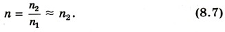 Глава 8. Световые волны § 61. Закон преломления света (окончание)Показатель преломления среды относительно вакуума называют абсолютным показателем преломления этой среды. Он показывает, во сколько раз скорость света в вакууме больше, чем в среде, и равен отношению синуса угла падения к синусу угла преломления при переходе светового луча из вакуума в данную среду: Пользуясь формулой (8.5), можно выразить относительный показатель преломления через абсолютные показатели преломления n1 и n2 первой и второй сред. Действительно, так как