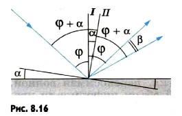 Глава 8. Световые волны Световые волны: Примеры решения задач1. Плоское зеркало повернули на угол α = 17° вокруг оси, лежащей в плоскости зеркала. На какой угол β повернется отраженный от зеркала луч, если направление падающего луча осталось неизменным? Р е ш е н и е. Пусть φ — первоначальный угол падения луча (рис. 8.16). По закону отражения угол отражения также равен φ, и, следовательно, угол между падающим лучом и отраженным лучом равен 2φ. При повороте зеркала на угол α перпендикуляр I к зеркалу, восставленный в точке падения, также повернется на угол α и займет положение II. Значит, новый угол падения будет равен φ + α. Таким же будет и новый угол отражения.