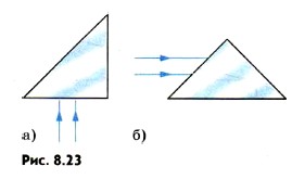 9. Изобразите ход лучей через треугольную стеклянную призму, основанием которой является равнобедренный прямоугольный треугольник. Лучи падают на призму, как показано на рисунке (8.23, а, б.) Останется ли ход лучей таким же, если призму погрузить в воду?