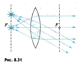 Поместив светящуюся точку в фокусе линзы (или в любой точке ее фокальной плоскости), получим после преломления параллельные лучи (рис. 8.31).