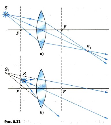 Если сместить источник дальше от фокуса линзы, лучи за линзой становятся сходящимися и дают действительное изображение (рис. 8.32, а). Когда же источник находится ближе фокуса, преломленные лучи расходятся и изображение получается мнимым (рис. 8.32, б).