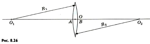 Тонкая линзаМы рассмотрим наиболее простой случай, когда толщина линзы l = АВ пренебрежимо мала по сравнению с радиусами R1 и R2 сферических поверхностей линзы (рис. 8.26) и расстоянием предмета от линзы. Такую линзу называют тонкой линзой. В дальнейшем, говоря о линзе, мы всегда будем подразумевать тонкую линзу. Точки А и В — вершины сферических сегментов — расположены в тонкой линзе столь близко друг от друга, что их можно принять за одну точку, которую называют оптическим центром линзы и обозначают буквой О. Луч света, который проходит через оптический центр линзы, не изменяет своего направления, а только смещается, но, так как линза тонкая, этим смещением можно пренебречь.
