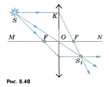 Р е ш е н и е. Луч, проходящий через оптический центр линзы, не отклоняется от своего направления. Поэтому оптический центр О совпадает с точкой пересечения прямых SS1 и MN (рис. 8.40). Проведем луч SK, параллельный главной оптической оси. Преломленный луч KS1 пройдет через фокус. Зная, что луч, падающий на линзу через фокус, после преломления идет параллельно главной оптической оси, находим другой фокус. Линза является собирающей, а изображение — действительным.