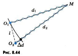 Можно одновременно возбудить две круговые волны в ванне с помощью двух шариков, укрепленных на стержне, которые совершают гармонические колебания (рис. 8.43). В любой точке М на поверхности воды (рис. 8.44) будут складываться колебания, вызванные двумя волнами (от источников O1 и O2). Амплитуды колебаний, вызванных в точке М обеими волнами, будут, вообще говоря, различаться, так как волны проходят различные пути d1 и d2. Но если расстояние l между источниками много меньше этих путей (l « d1 и l « d2), то обе амплитуды можно считать практически одинаковыми.